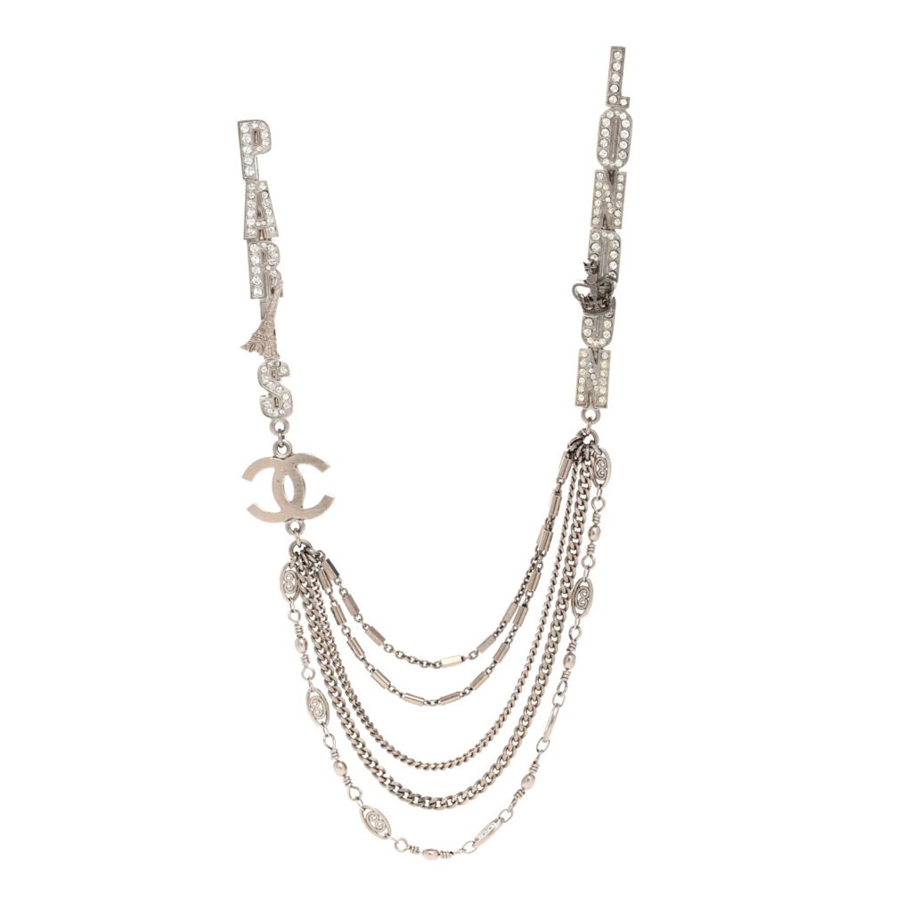 This is an authentic CHANEL Crystal CC London Paris multi-strand chain brooch in silver. This chic accessory features a sparkling, crystal-embellished “London” and “Paris” design, paired with a brushed silver CC logo and multi-strand chain strands for a bold, elegant statement.