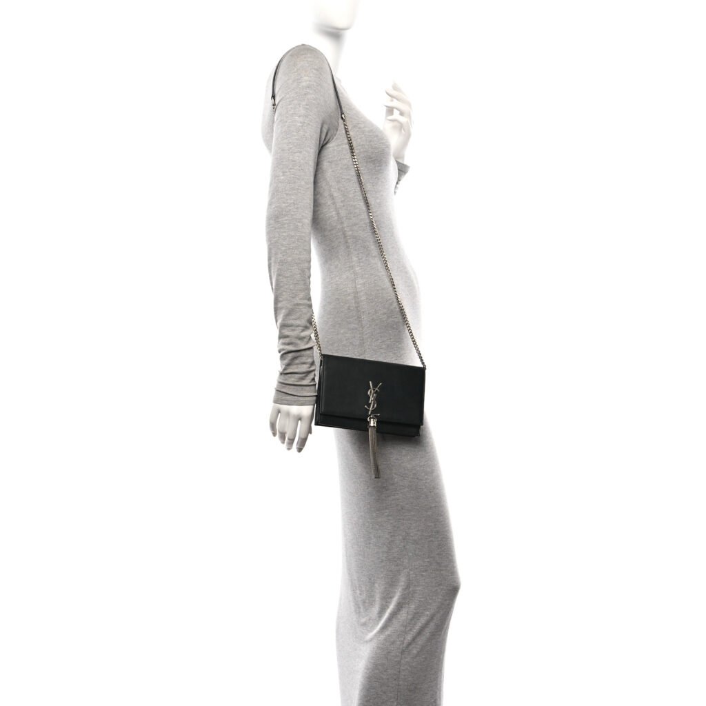 This is an authentic SAINT LAURENT Classic Monogram Kate Tassel Chain Wallet crafted from black smooth calf leather. Sleek and compact, this stylish shoulder bag features a silver chain crossbody strap, a front flap with the iconic silver YSL logo, and a delicate silver tassel accent. The flap opens to a sleek black interior, thoughtfully designed with a zipped compartment, card slots, and a slip pocket for essentials.