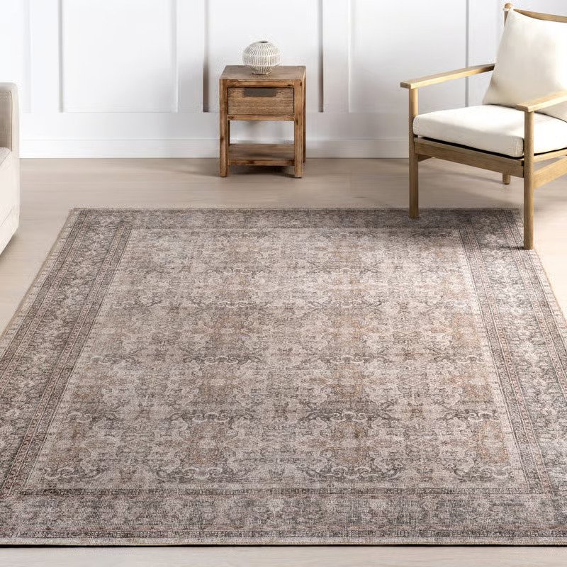 This rug offers a vintage aesthetic with the practicality of modern materials.